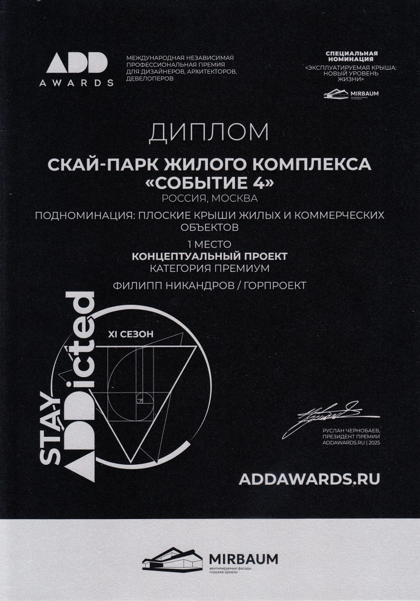 ГОРПРОЕКТ удостоен награды: скай-парк жилого комплекса «Событие.4» признан лауреатом специальной номинации «Эксплуатируемая крыша: новый уровень жизни».
